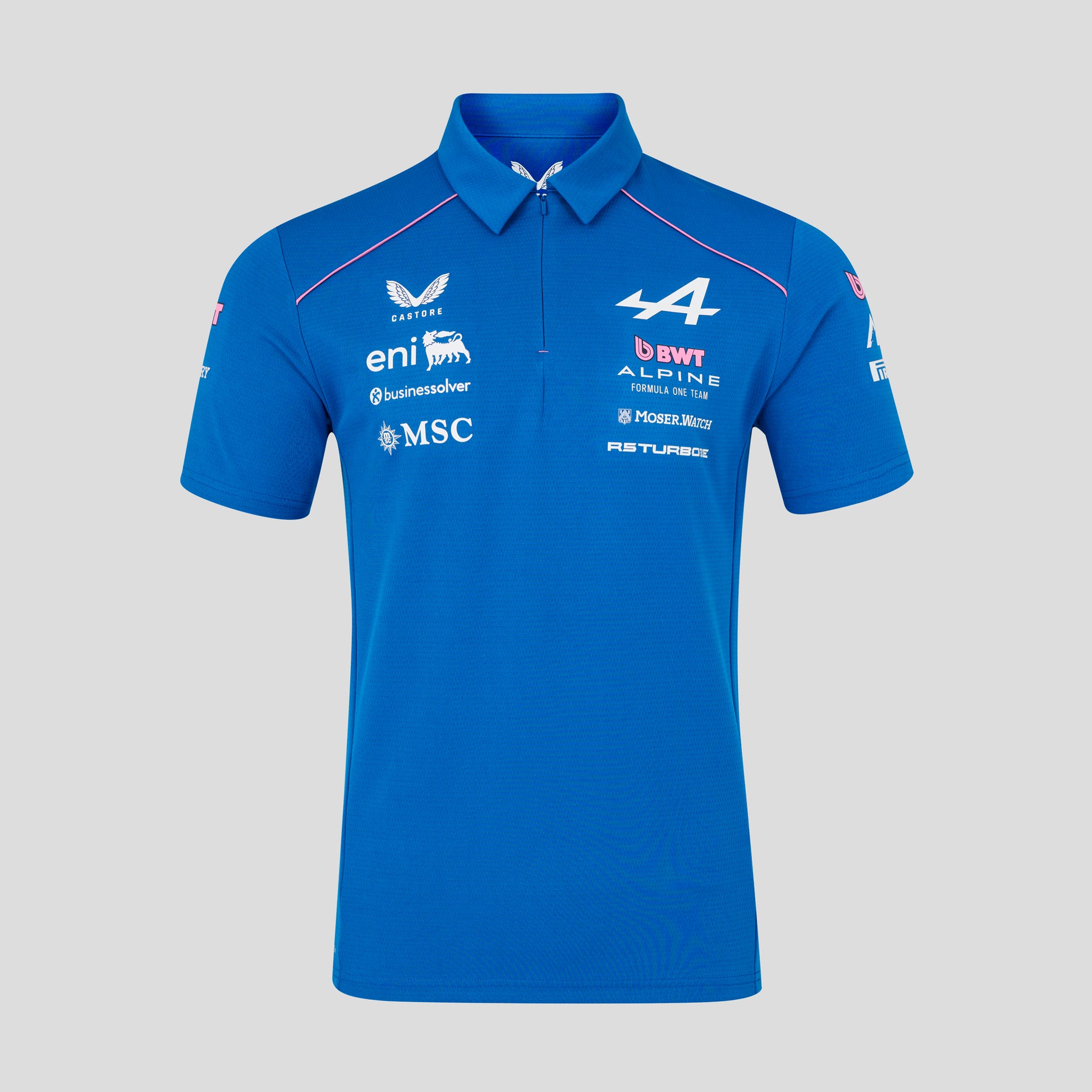 The BWT Alpine Formula One Team Men's Official Short Sleeve Polo will keep you close to your favourite crew this season. This dynamic design from the team’s 2026 Replica collection has set-in short sleeves, a classic neckline, and contrasting Pink highlights. The Polo features all the official sponsors and branding throughout, allowing you to seamlessly declare yourself a loyal fan.