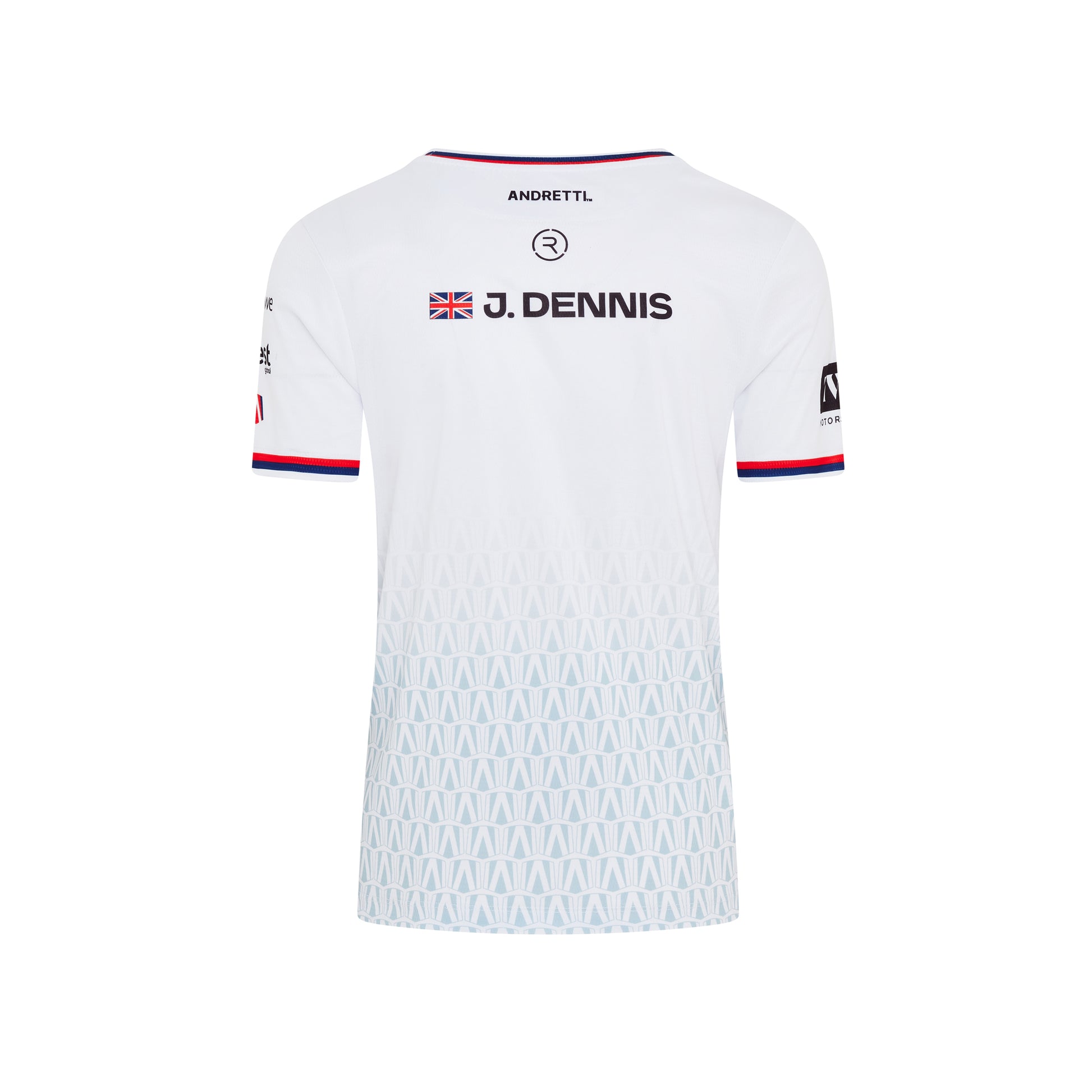 Rep Jake Dennis with this clean white driver tee featuring his race number and bold Andretti Formula E detailing. Made from 100% recycled polyester, it delivers breathable comfort and a crisp fan-first look.