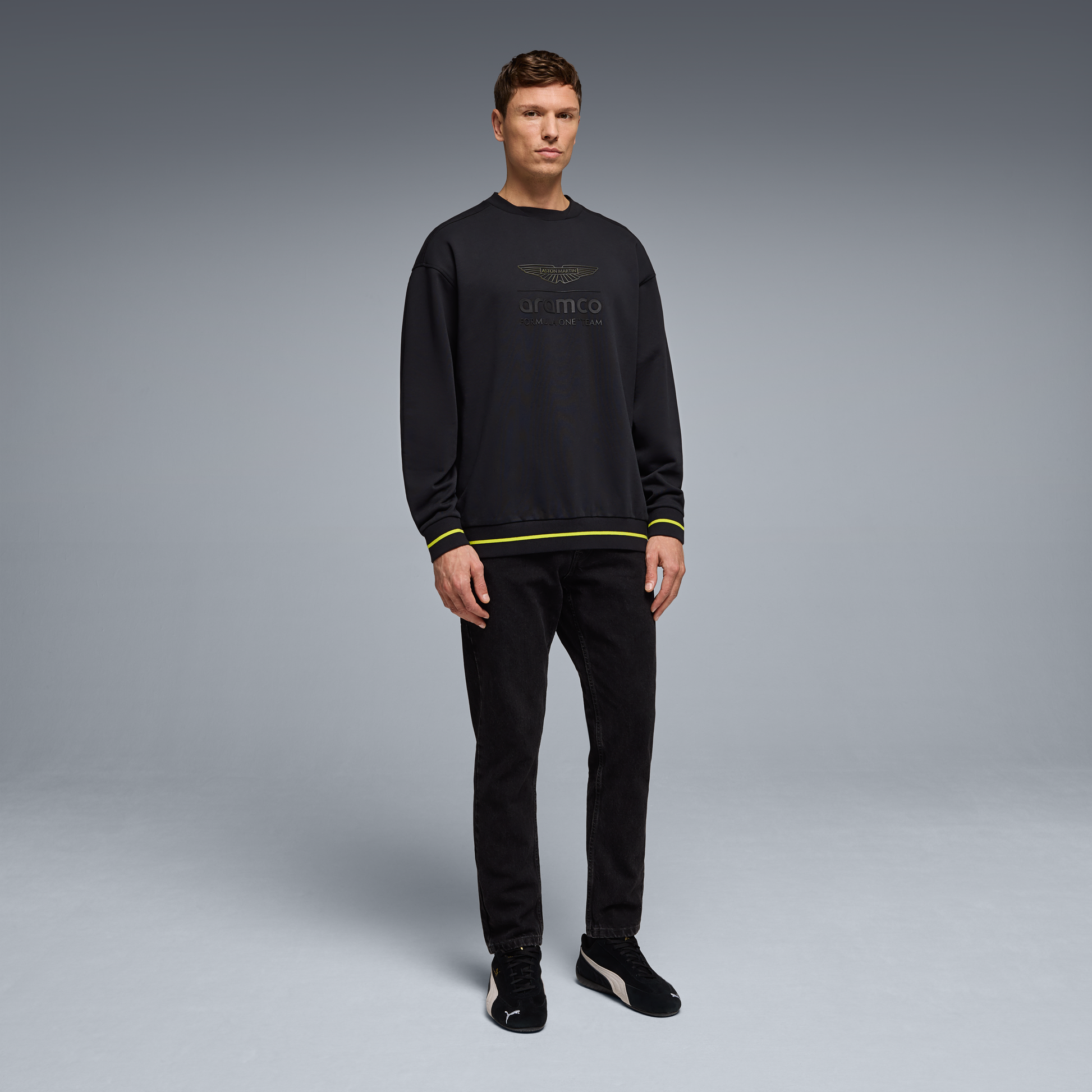 Keep it clean and understated with the Aston Martin F1 Logo Stealth Crew Sweat for men in black. Designed for everyday comfort, this crew neck sweat features subtle Aston Martin Formula One Team stealth branding and a modern, relaxed fit.