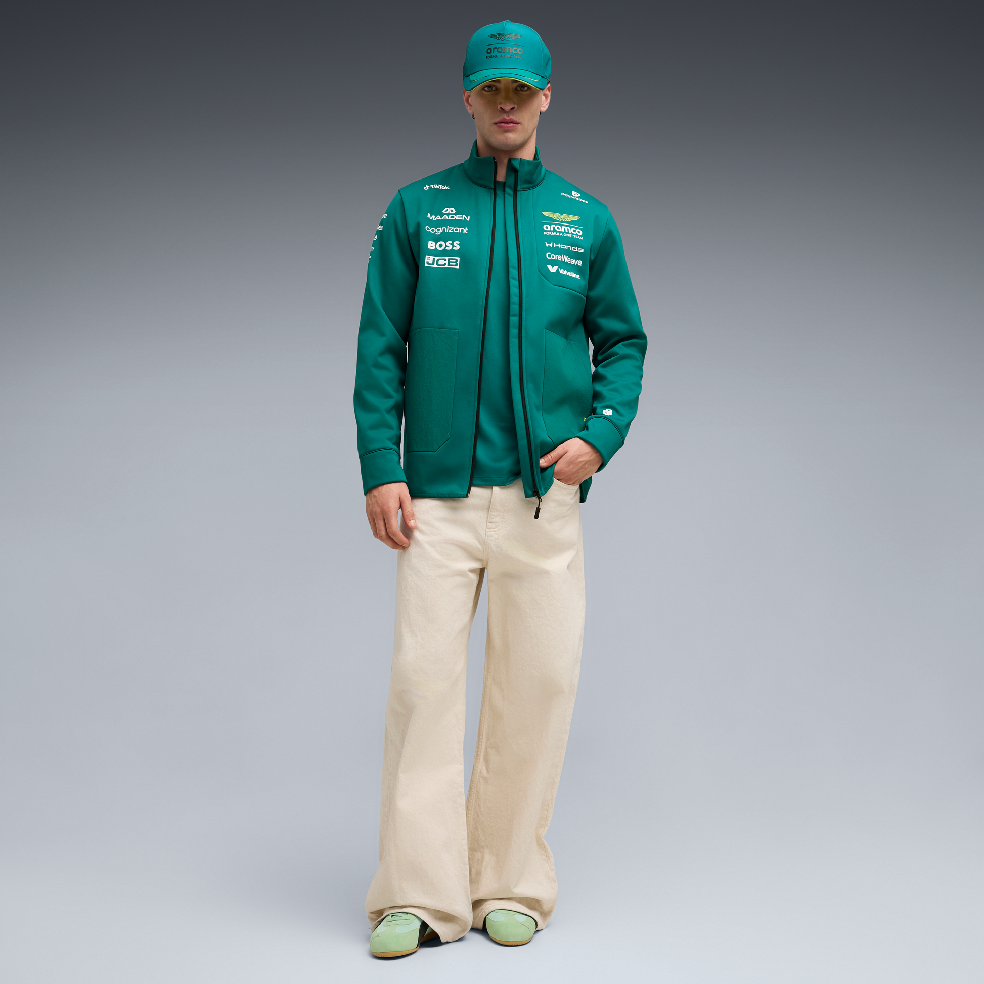 Support the Aston Martin Aramco Formula One® Team in style with the official Aston Martin F1 Team 2026 Softshell Jacket for Men. Finished in the signature Green Lux colour, this Softshell Jacket features authentic team branding inspired by the 2026 season, delivering a smart and professional look for all fans of the Silverstone based team.