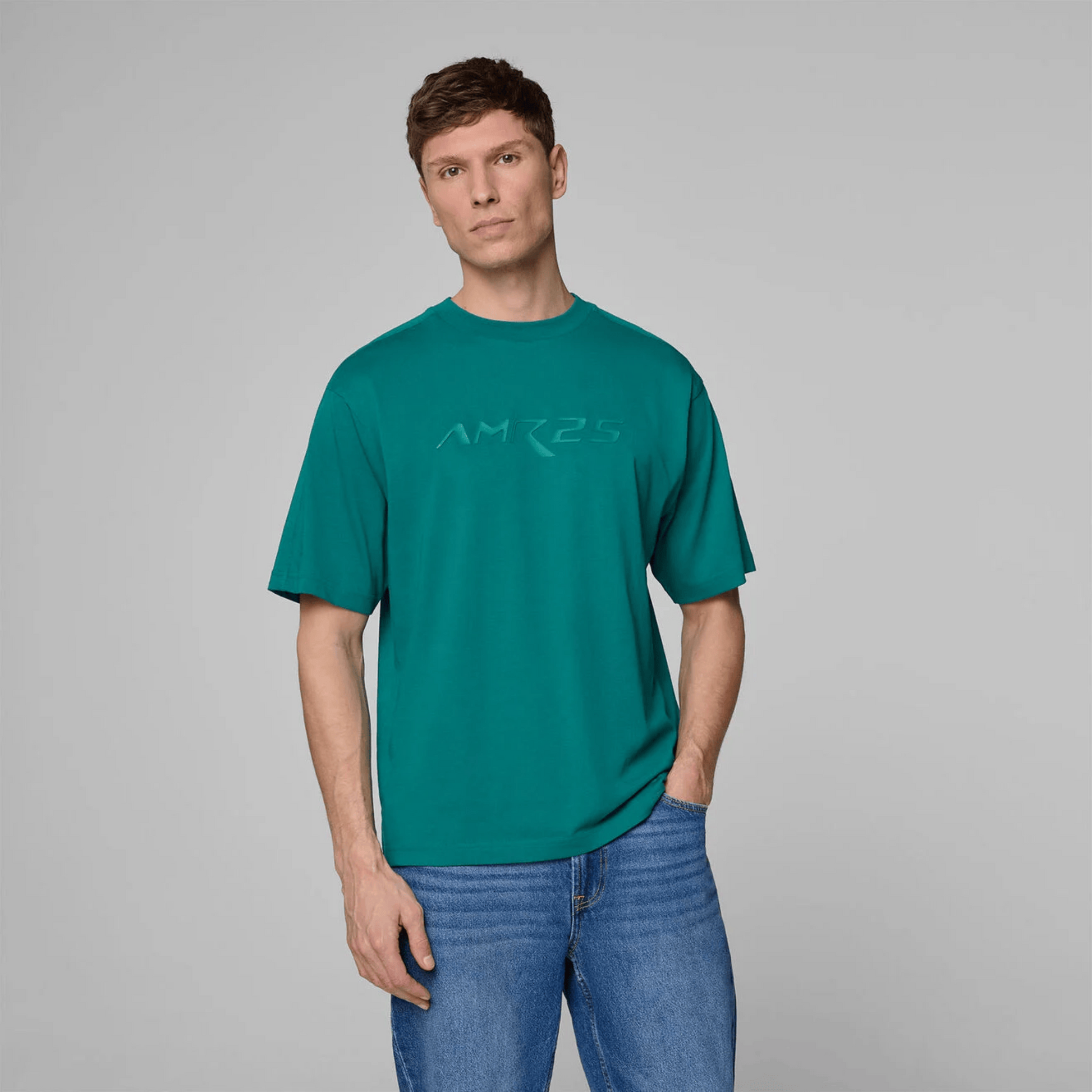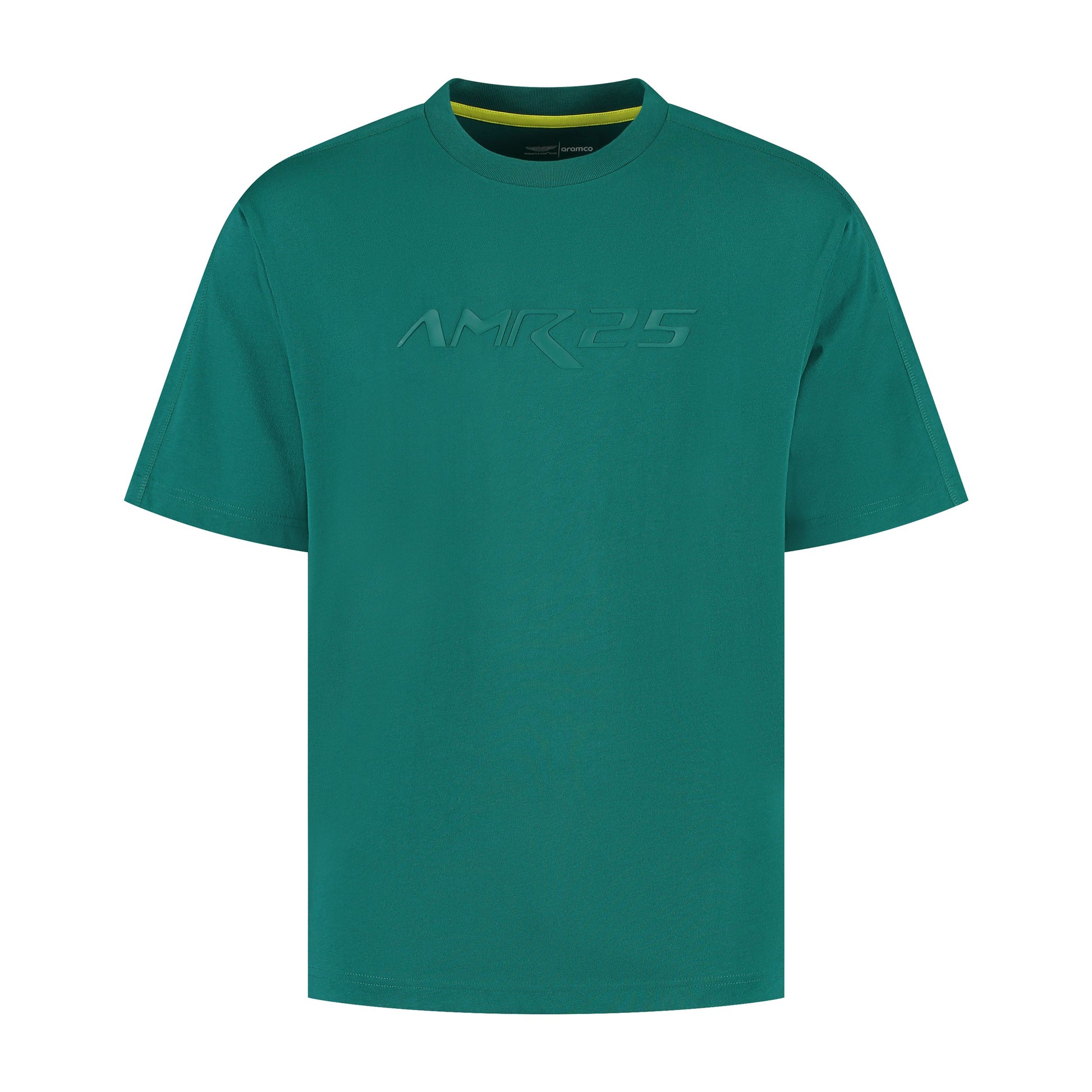 Aston Martin F1 AMR25 T-Shirt. 100% cotton Aston Martin Formula One Team Tee with AMR25 logo on the chest and small team logo badge at the hem. Oversized fit.