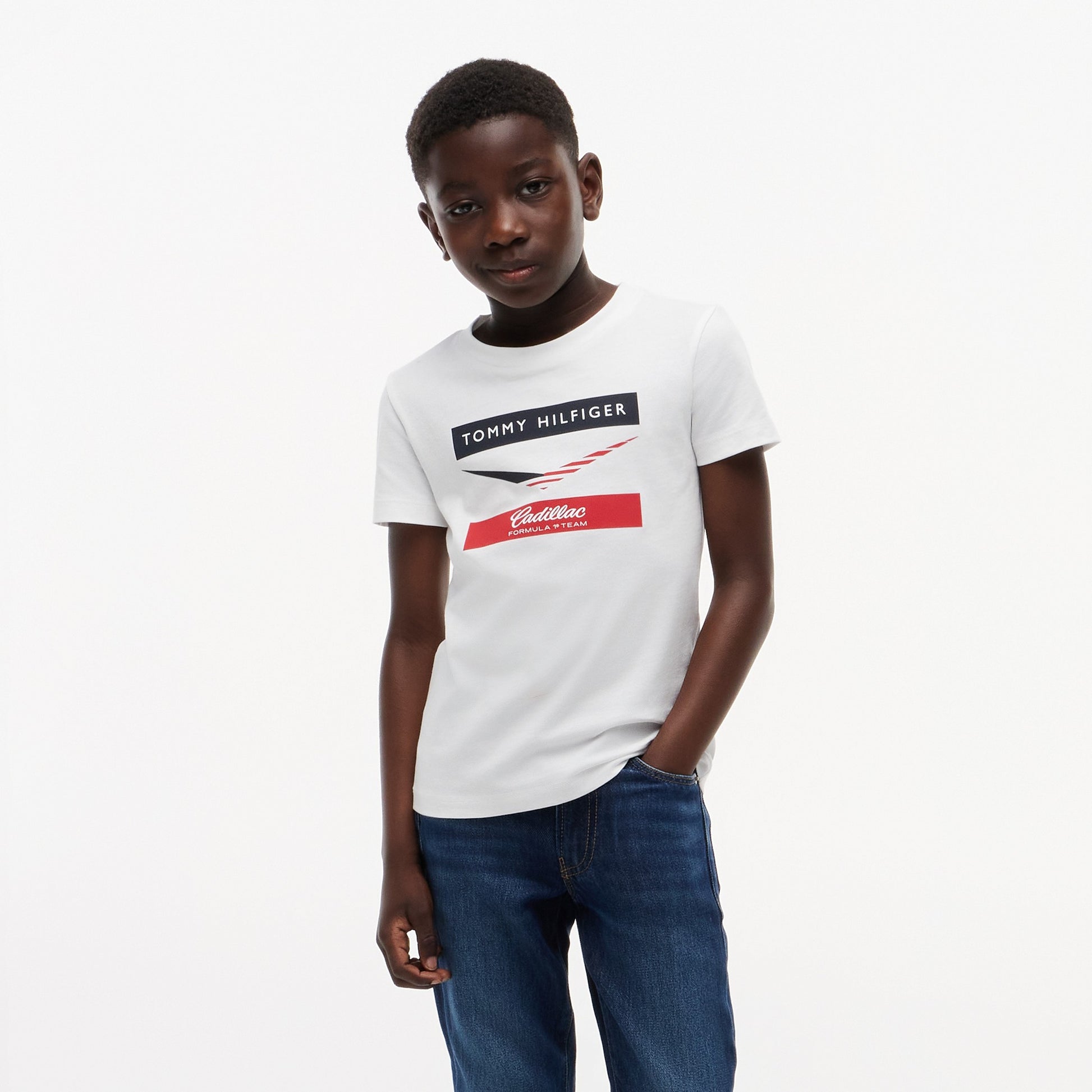Get young fans ready for race day with the Cadillac F1 x Tommy Hilfiger Chevron T‑Shirt for Kids in crisp white. This premium kids’ tee blends American motorsport‑inspired style with iconic Tommy Hilfiger design for standout casual appeal.