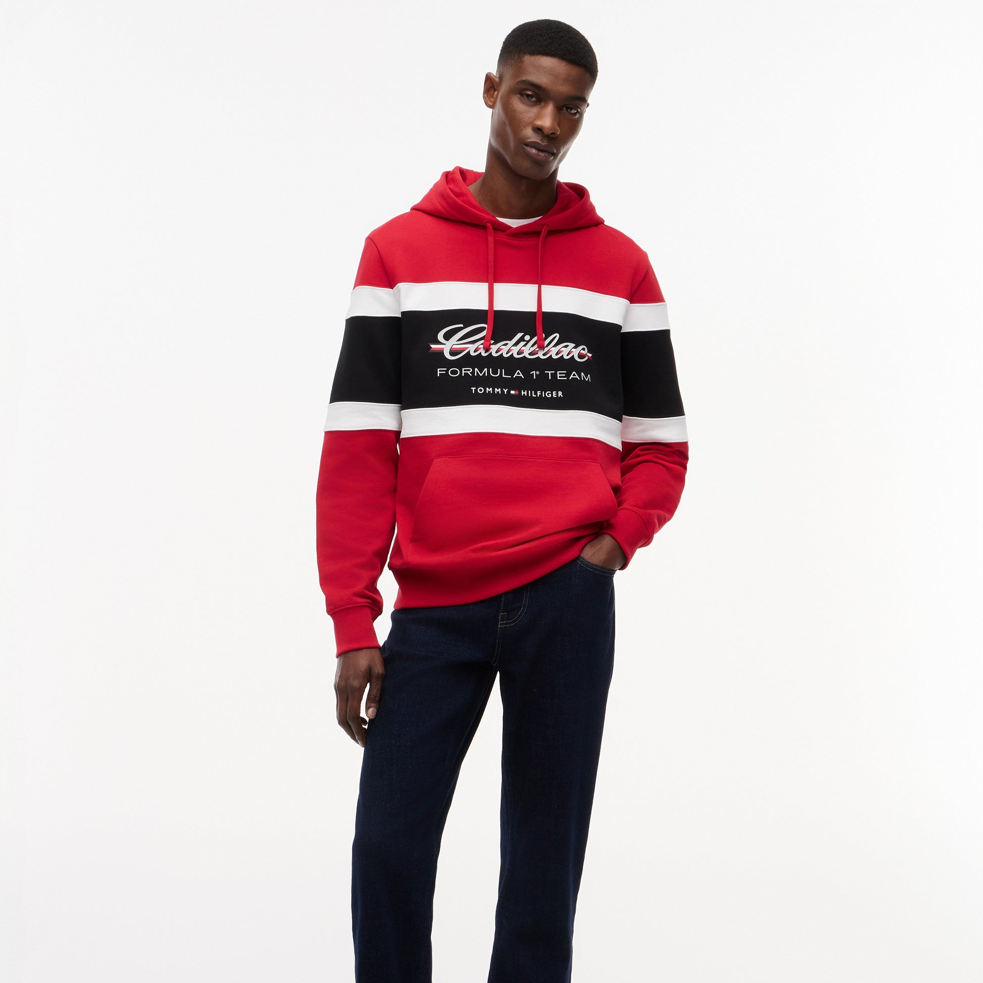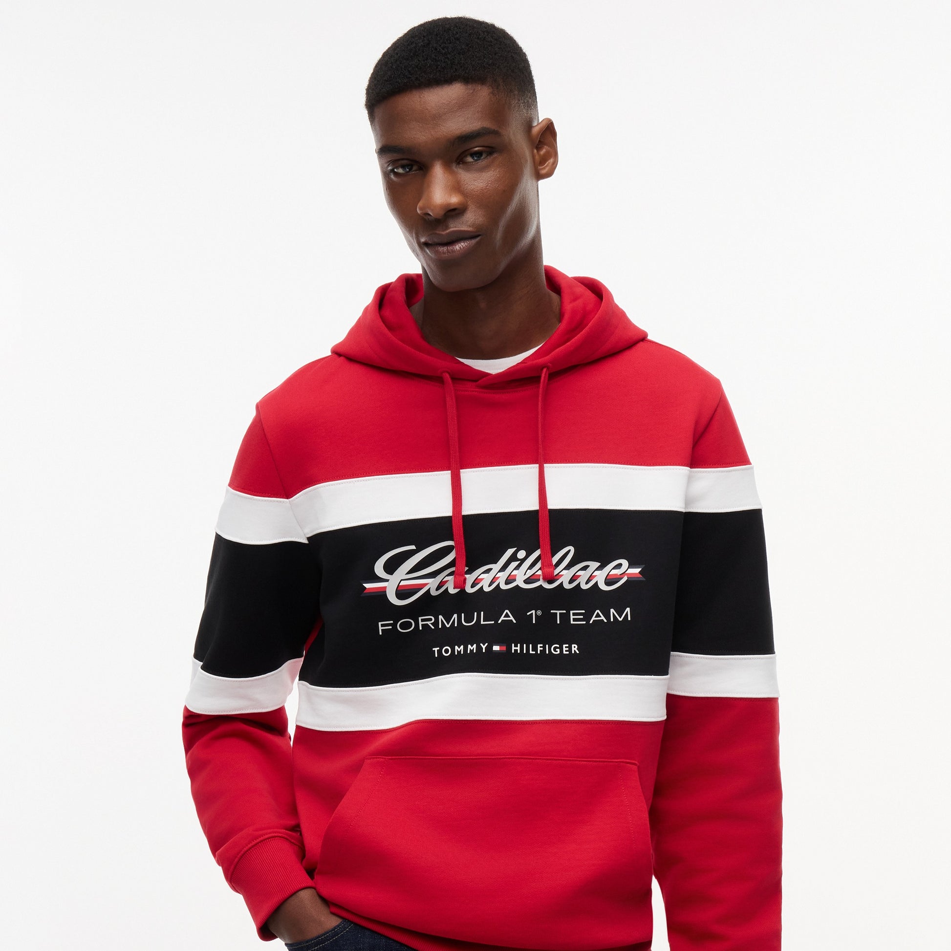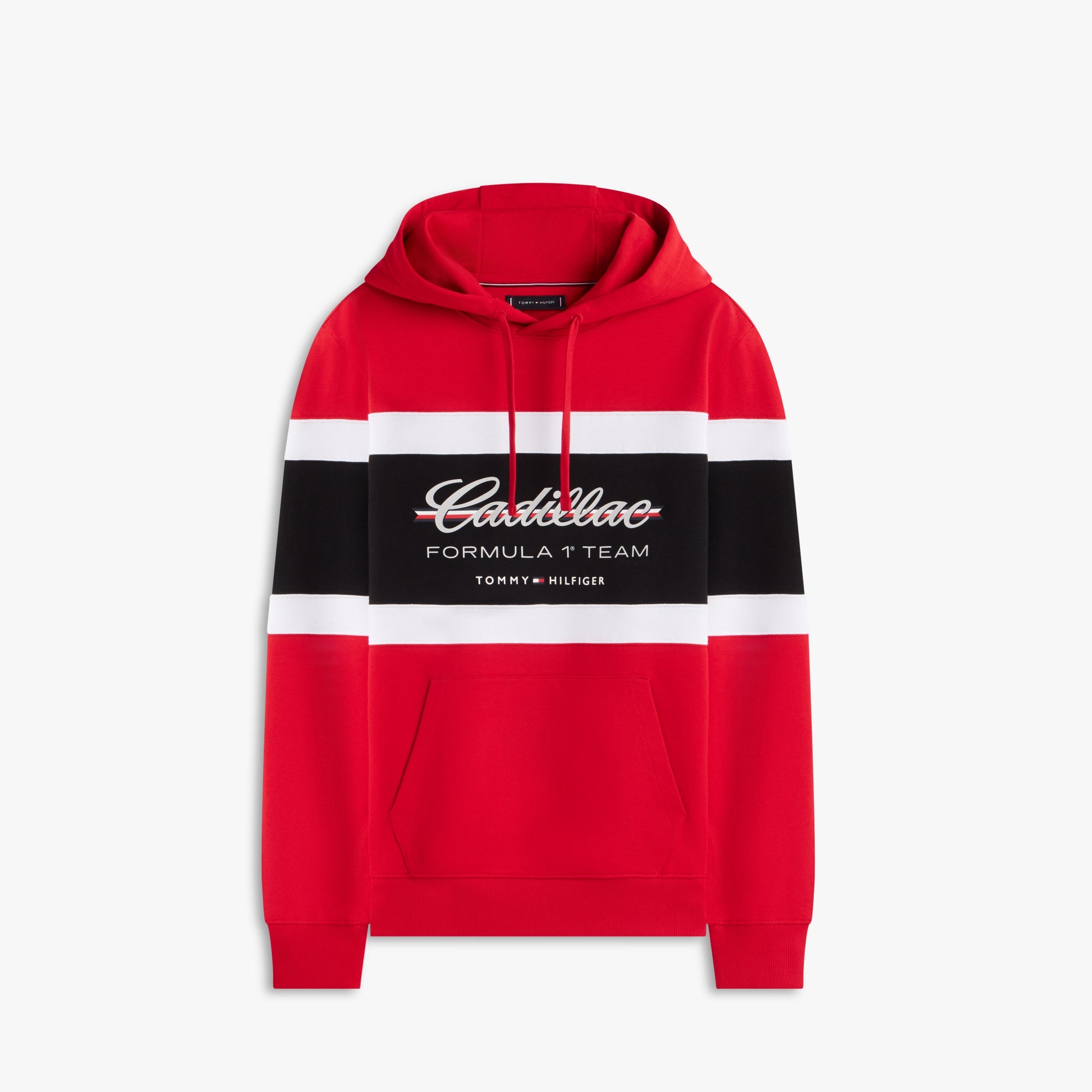 Stay comfortable with motorsport style in the Cadillac F1 x Tommy Hilfiger Panelled Hoodie for Men in Red. This premium men’s hoodie blends bold panelled design with iconic Tommy Hilfiger x Cadillac Formula 1 Team branding for standout casual appeal.