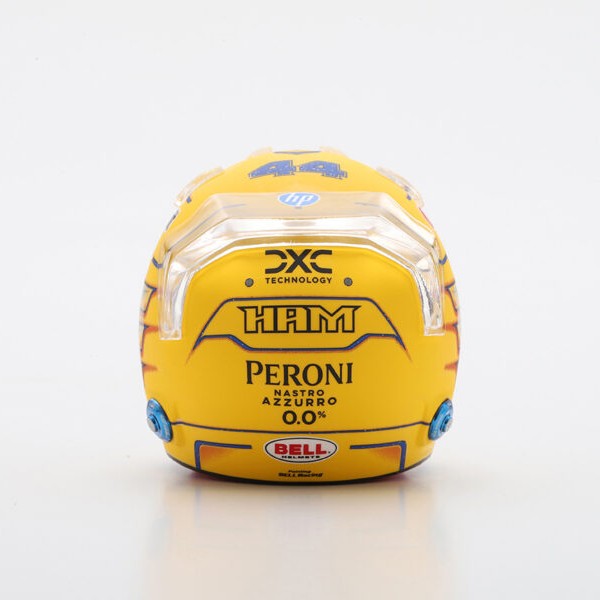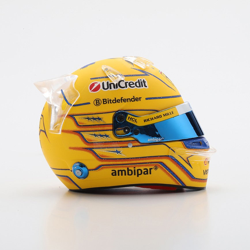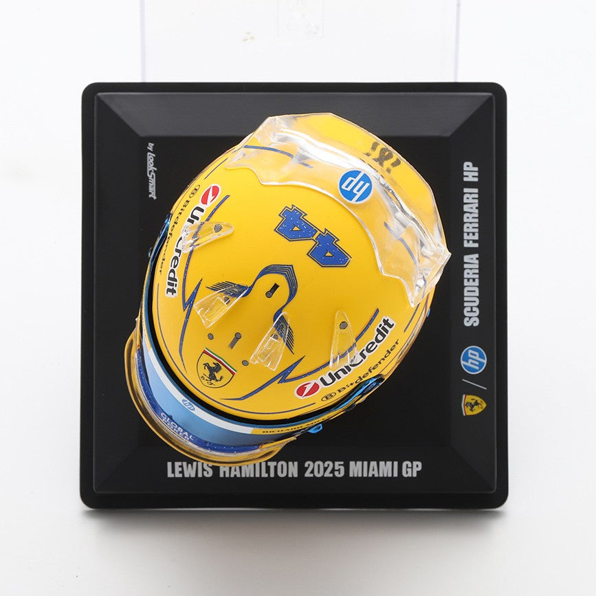 Look Smart 1:5 resin model of the Lewis Hamilton Ferrari helmet from the 2025 Miami Grand Prix. Hamilton ran a one-off Yellow and Blue design in this race, to compliment the extra blue touches to his Ferrari. He finished a brilliant 3rd in the Sprint race considering the treacherous conditions. The following day he placed sixth in the main race.