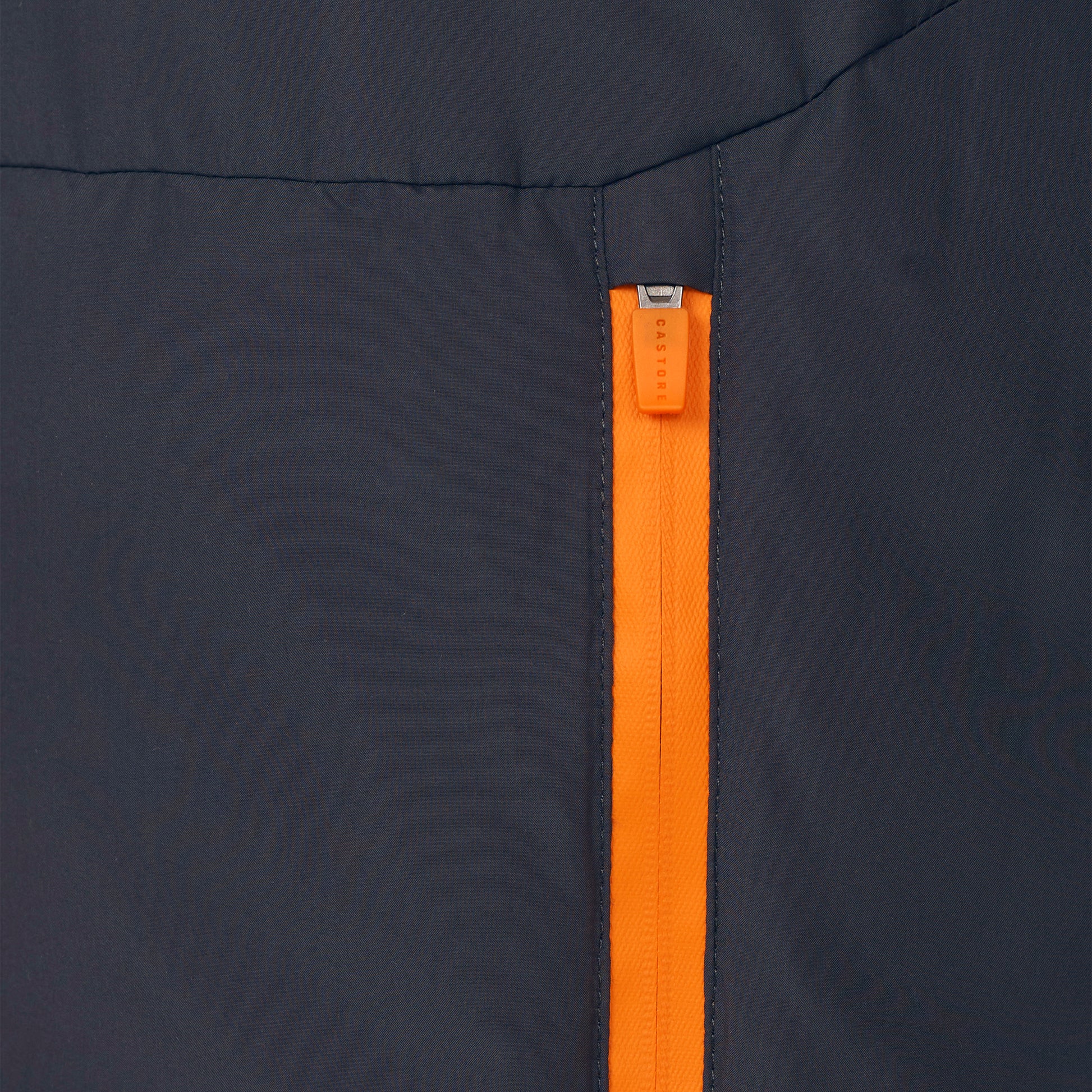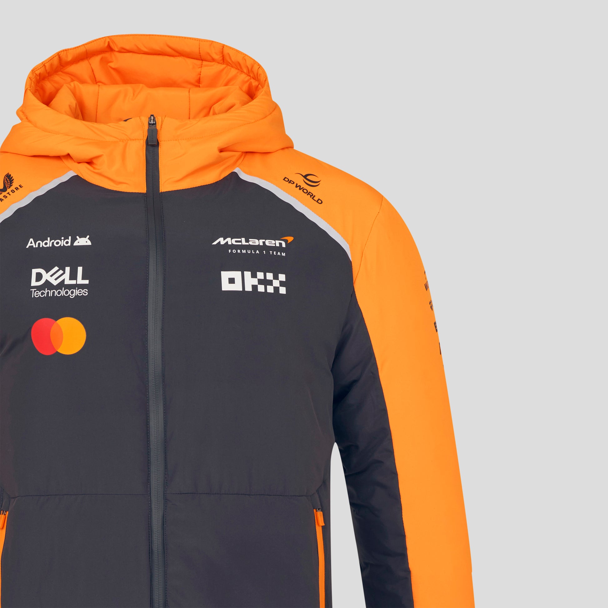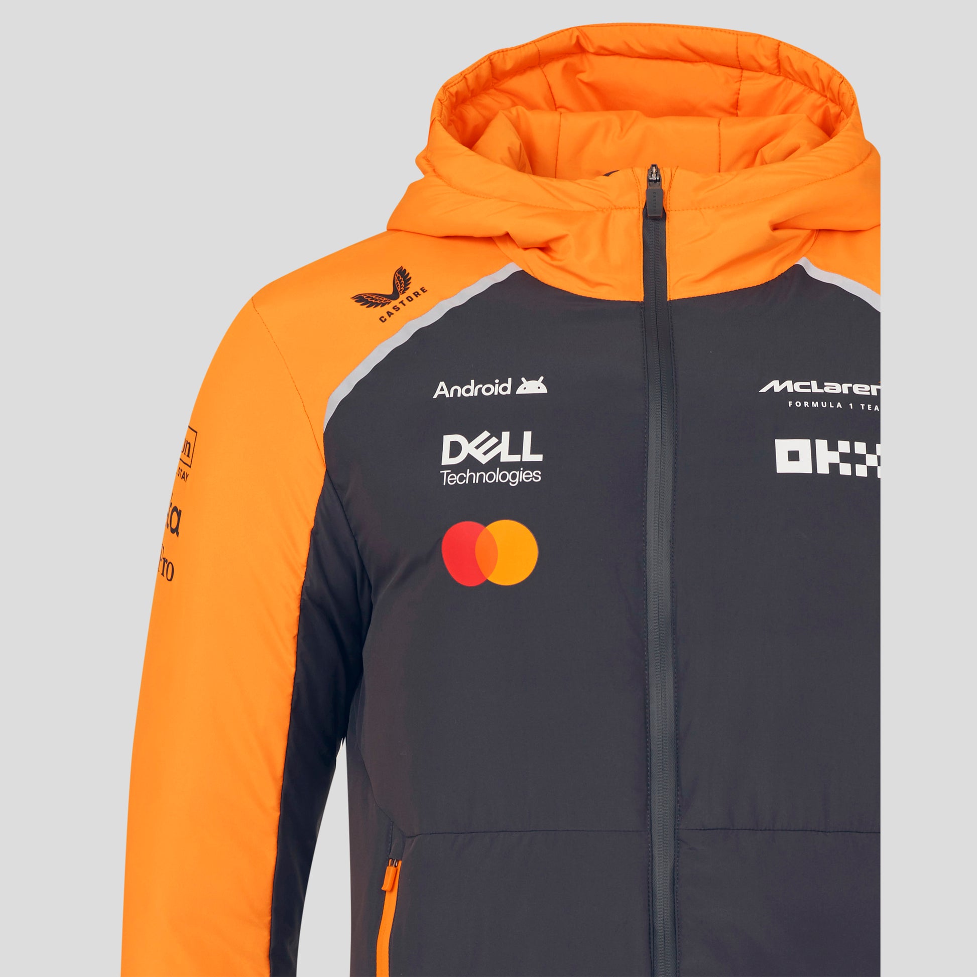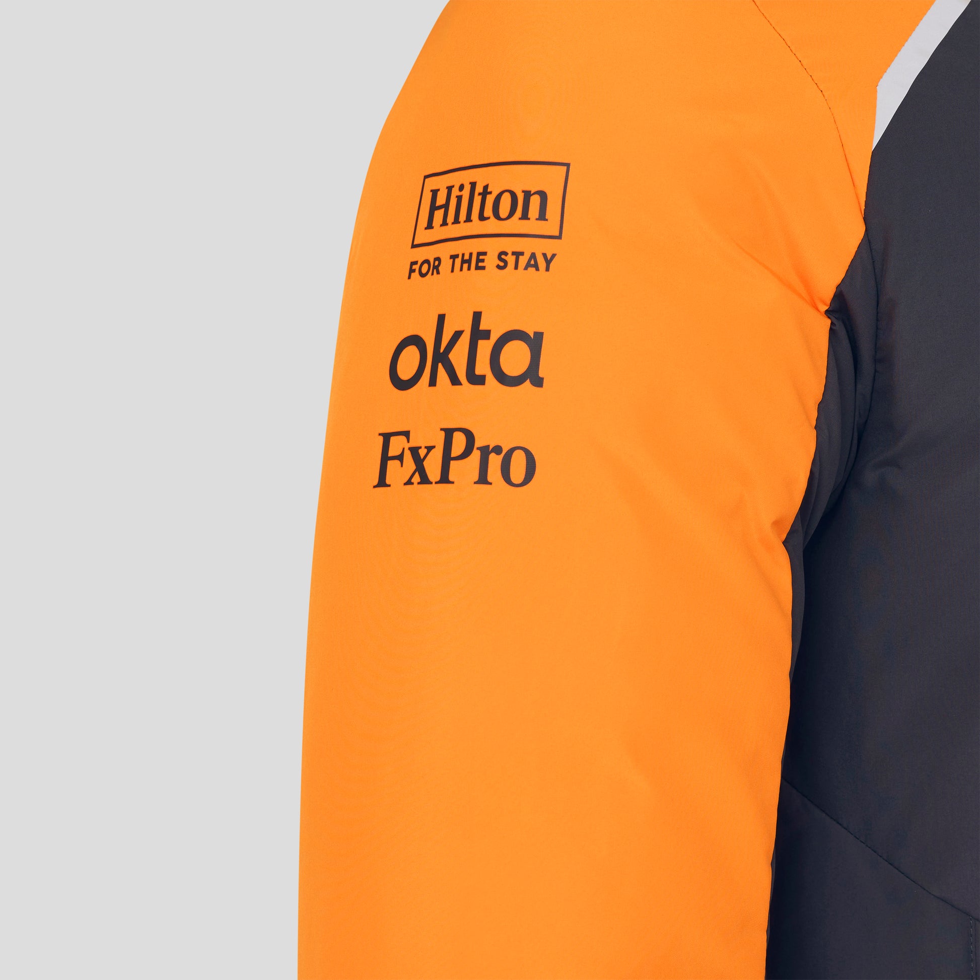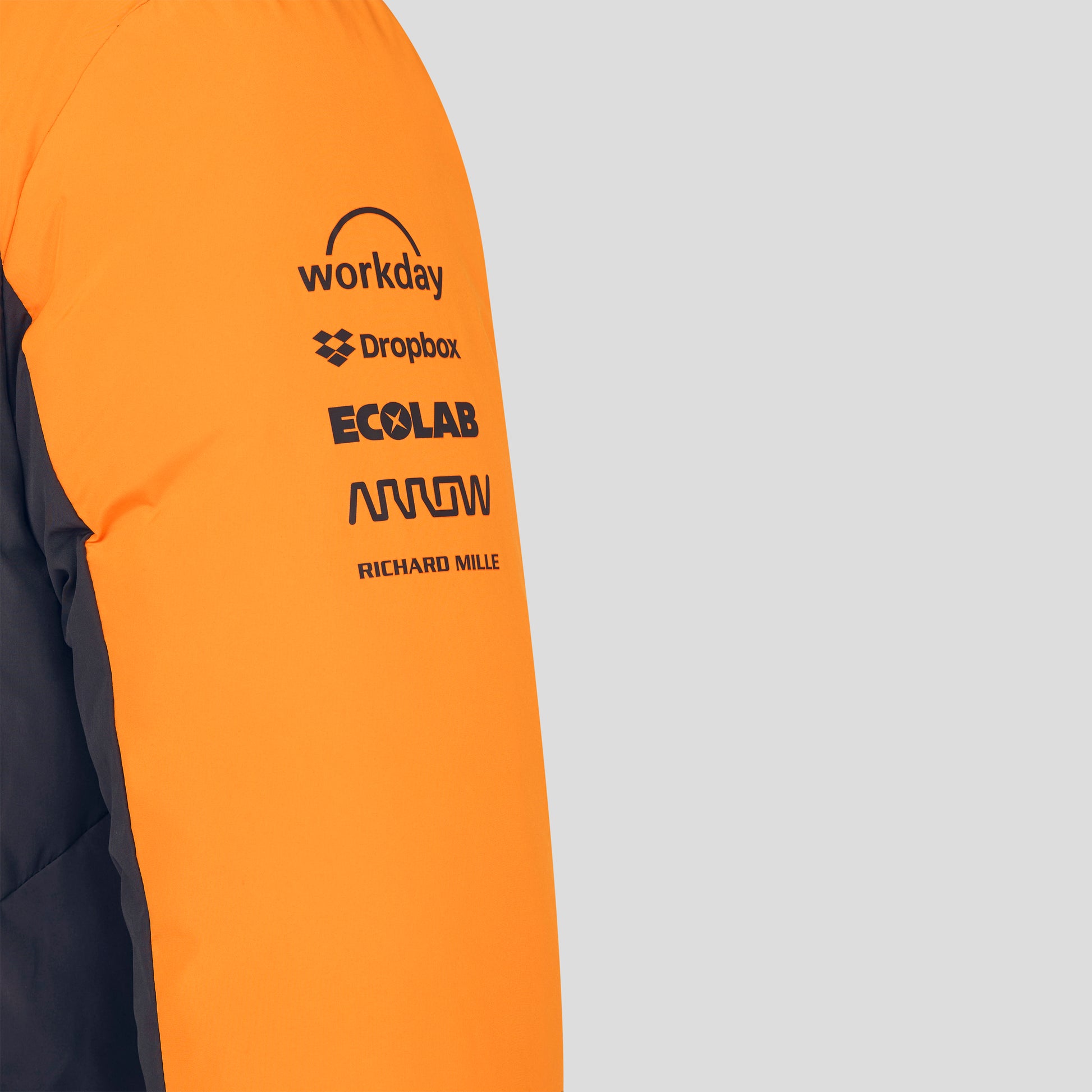 New to Castore's 2025 range, the McLaren Racing Formula 1 Longline Padded Team Jacket features an extended length for extra coverage, making it ideal for race days in harsh weather.
